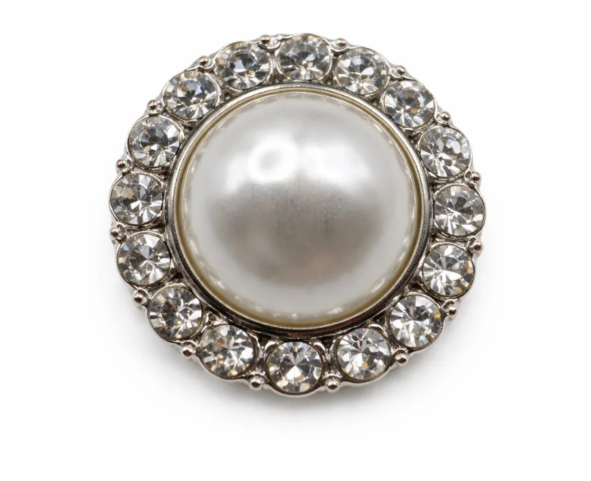 This classic pearl and crystal halo button in silver features a sparkling design with sew-on functionality for versatile attachment. Ideal for enhancing jackets, blouses, scarves, or handbags, it adds a refined and elegant accent to both casual and formal outfits. Lightweight and stylish, it is perfect for personal accessorizing or as a thoughtful gift.
