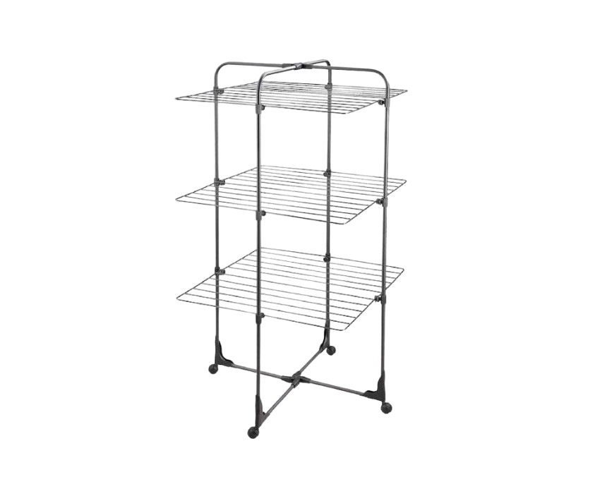 The Leifheit Classic Tower 270 Black Tower Drying Rack provides 27 meters of drying space while occupying minimal floor area. Its folding shelves and wheeled design make it easy to move and store, perfect for small spaces. Compact when closed at 126 x 69 x 4 cm and open at 126 x 69 x 73 cm, it efficiently dries multiple items of laundry at once.