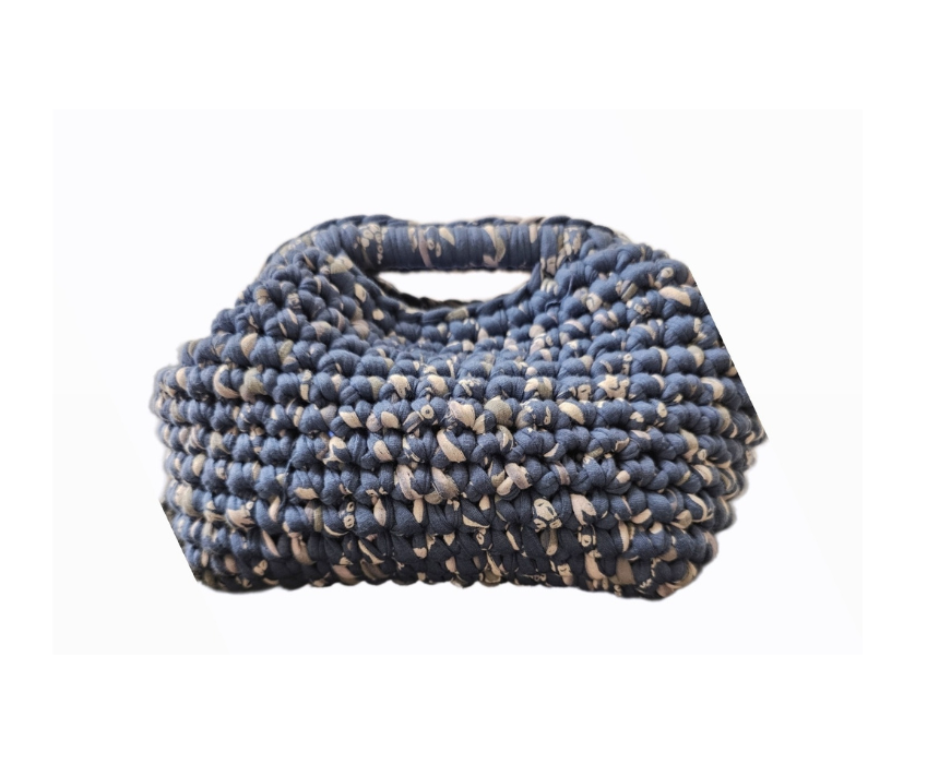 This clutch bag is handcrafted from soft tshirt yarn in a stylish jeans blue cotton, offering a modern and durable accessory for day or night. Its compact shape makes it easy to carry, and it can be styled as a chic accent with casual denim outfits or used to add a subtle pop of color to dressier looks.