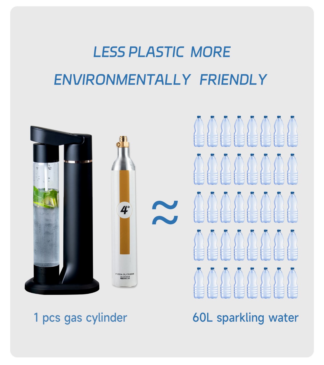 This 60L CO₂ soda carbonator cylinder delivers clean, food grade carbonation for homemade sparkling water and fizzy drinks, compatible with all standard 60L soda makers in EU and US systems. Filled with 410 g of high purity CO₂, it carbonates up to 60 liters, offering an eco friendly, refillable solution that reduces plastic waste and saves money.