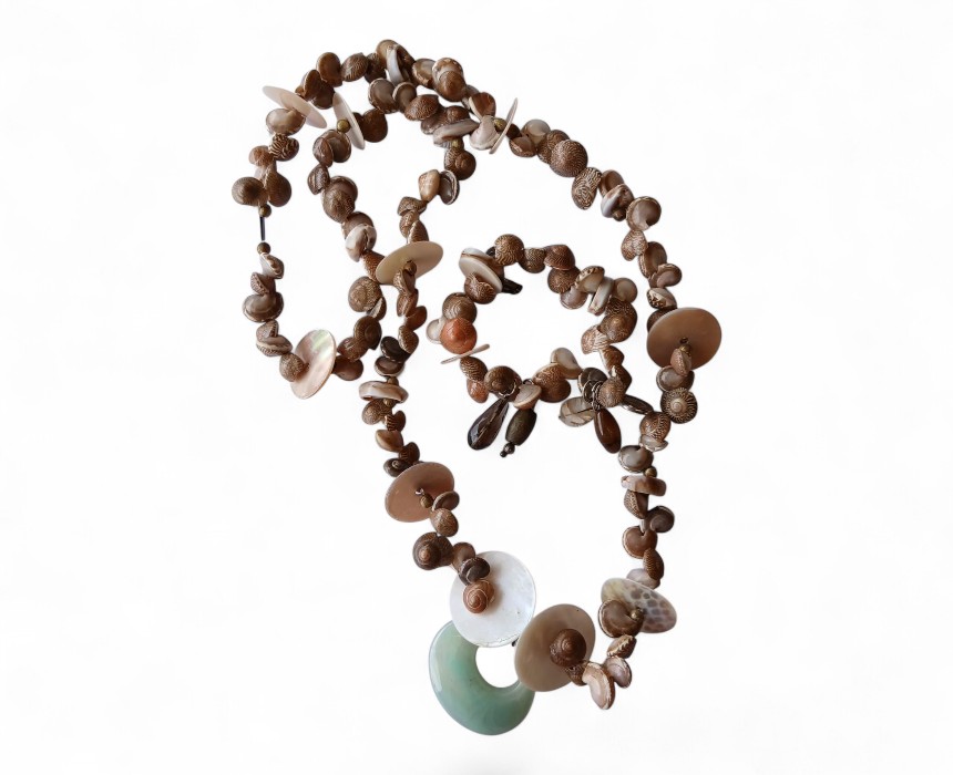 Capture the essence of the ocean with the “Ref. # 59” handmade jewelry set. This unique duo includes a long necklace and a matching bracelet, beautifully crafted with genuine seashells and round optical beads that catch the light with every movement. The design is centered around a stunning round light green pendant, providing a fresh and calming focal point. Meticulously assembled for a high-end artisan finish, this set is perfect for those who love organic textures and coastal-inspired elegance. Light and stylish.
