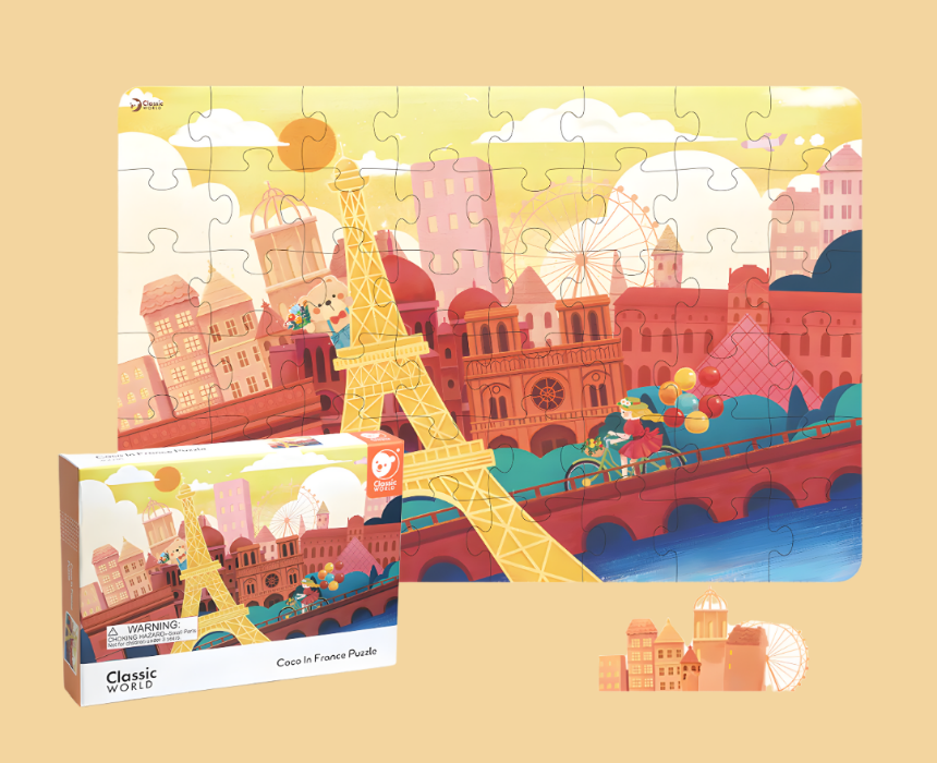 This Classic World Coco in France Puzzle is suitable for children aged 3 years and above and includes 48 pieces. Guided by Coco the bear, children explore Paris, from the Eiffel Tower to the Louvre, while developing concentration, fine motor skills, hand eye coordination, and problem solving. The colorful design encourages imagination, curiosity, and learning about French culture through fun and engaging play.