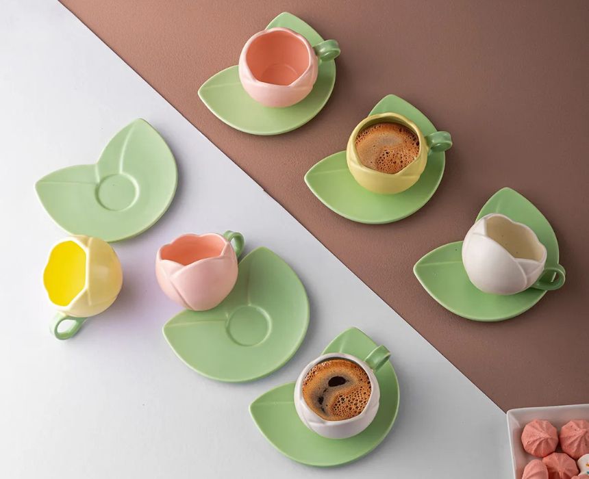 This set of 6 porcelain coffee cups with leaf-shaped plates features a charming mix of yellow, white, and pink colors, with 2 pieces of each. Each 90ml cup is perfect for serving Turkish or espresso-style coffee in elegant gatherings or everyday moments. Made in Turkey, this colorful set adds a stylish, cheerful touch to your coffee routine or makes a thoughtful gift.