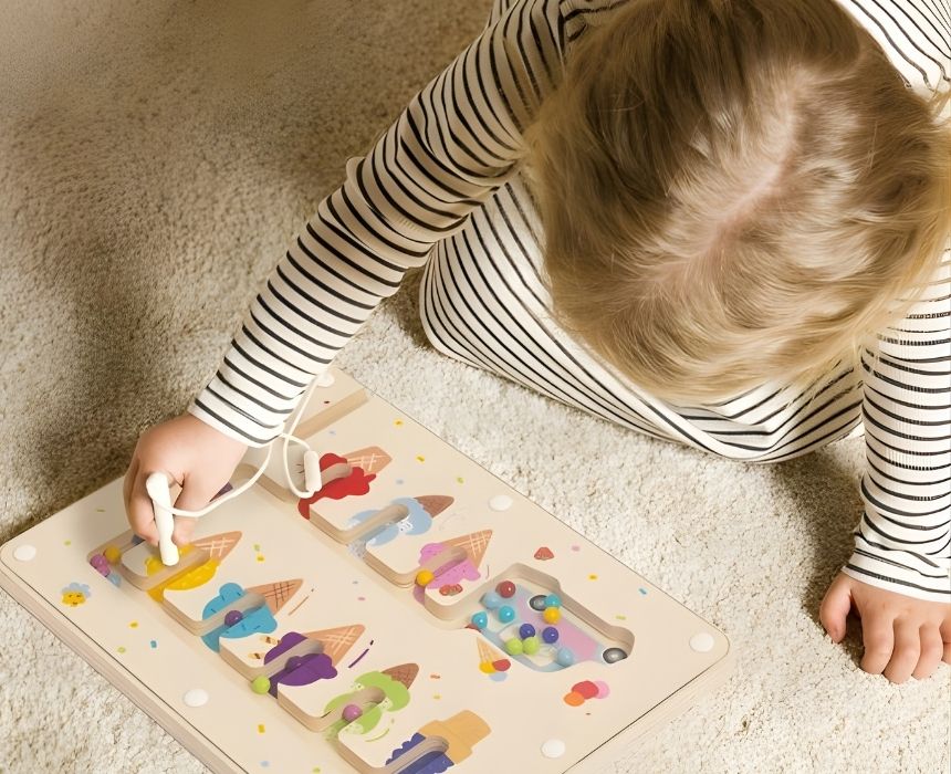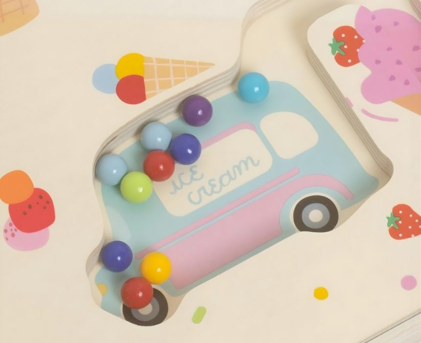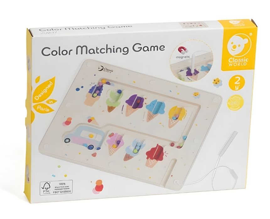 Match the colored balls to their corresponding ice cream with this fun magnetic maze. Use the attached magnetic pen to guide the balls through the board, developing your child’s color recognition and fine motor skills. The pen is securely attached so it never gets lost, making it an ideal travel toy. This interactive game encourages concentration and precision as children solve the puzzle to “serve” the right flavors. Crafted from high-quality wood for a durable, safe finish. Suitable for ages 24 months+.