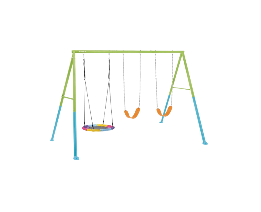 Delight your children with the Intex 3-piece Swing Set, featuring two swings and a bird’s nest seat that can accommodate up to three kids at a time. Made with rust-resistant galvanized tubing and comfortable plastisol chains, this colorful swing set ensures durability, safety, and all-year outdoor fun. Easy to assemble with included hardware and an anchoring system for stability, it provides a secure and enjoyable playground experience for toddlers and older children alike.