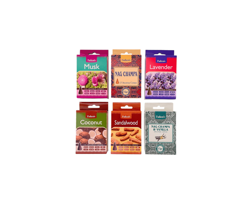Enjoy 6 bestseller incense cones in one convenient set, offering a variety of rich, long lasting fragrances to suit any mood or space. Crafted for smooth burning and consistent aroma, this all in one collection is perfect for relaxation, meditation, or refreshing your home. Simply light a cone, place it on a heat safe holder, and style it in your living room or meditation corner for a calming ambiance.