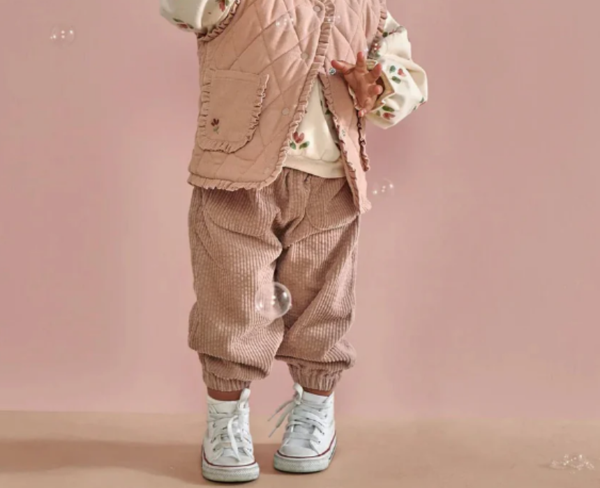 This Cord Quilted Gilet in pink is a sweet sleeveless layering piece designed to complete her outfit in charming style, featuring delicate frill edging, embroidery detailing, front patch pockets, and an easy popper fastening. Ideal for layering over dresses or tops on cooler days, it adds warmth while keeping the look soft and playful.