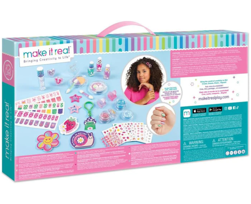 This all-in-one cosmetic and accessory kit features six themed collections—strawberry, cute critters, nostalgia, howdy, love, and magic—designed to match every mood or outfit. It includes eyeshadow, body glitter, lip gloss, nail polish, wraps, stickers, gems, and tools for complete manicures and pedicures. With two scented lip gloss rings, four hair clips, and a charm keychain, tweens can enjoy fun accessorizing while safely exploring makeup styling and self-expression.