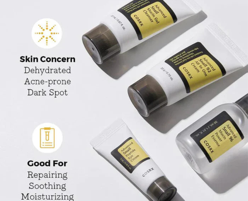 The COSRX Advanced Snail 4 Step Trial Kit features four best selling skincare essentials formulated with snail mucin to repair, soothe, and deeply moisturize the skin. This set includes the Advanced Snail Mucin Gel Cleanser 20ml, Snail 96 Mucin Power Essence 30ml, Snail Peptide Eye Cream 5ml, and Snail 92 All In One Cream 20g, making it ideal for dehydrated, acne-prone skin and dark spots. Use step by step after cleansing to experience a complete snail-powered routine.