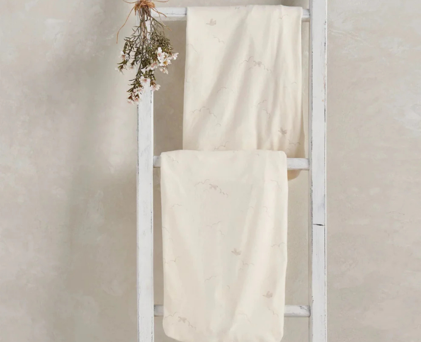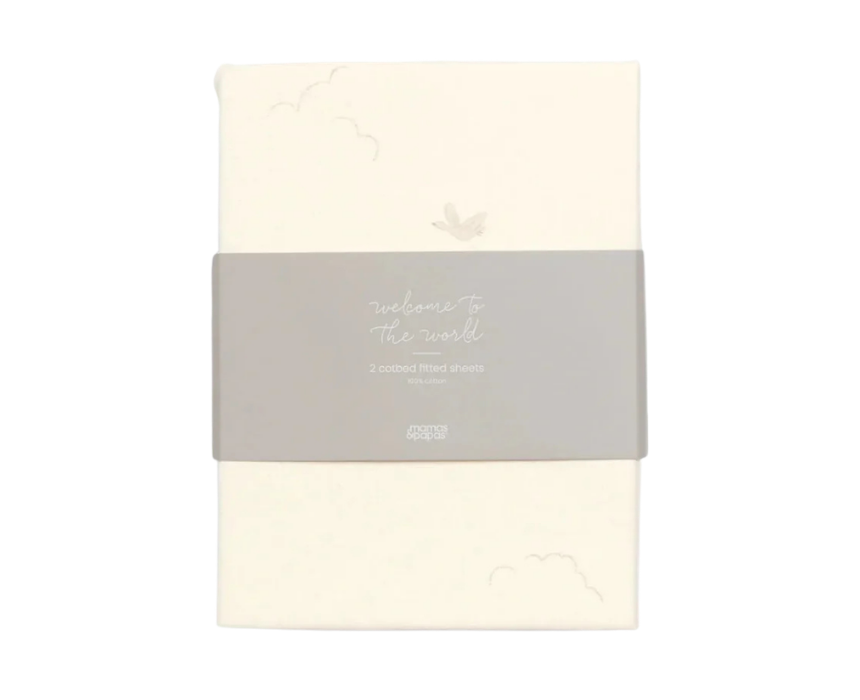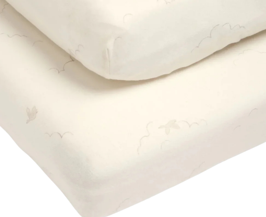 The cotbed fitted sheets pack includes two ultra-soft jersey cotton sheets designed to fit all cotbed mattresses securely. Featuring iconic hand-painted flying duck and cloud prints in soft beige tones on a cream base, they offer breathable comfort that is gentle on delicate skin while ensuring a cozy and restful night’s sleep. The natural stretch fabric maintains its shape wash after wash for everyday nursery use.