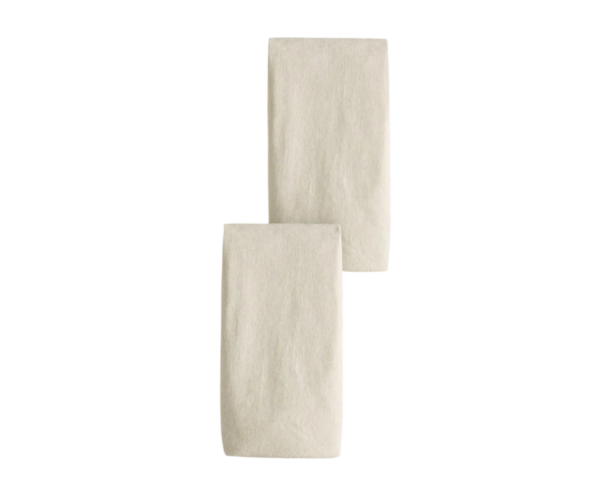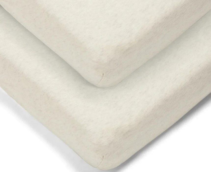 The cotbed fitted sheets pack includes two ultra-soft fitted sheets designed to fit standard cotbed mattresses securely. Made from durable cotton in a neutral oatmeal tone, they provide breathable comfort that is gentle on delicate skin while ensuring a cozy and restful sleep environment. Their snug fit and machine washable fabric make them ideal for everyday nursery use.