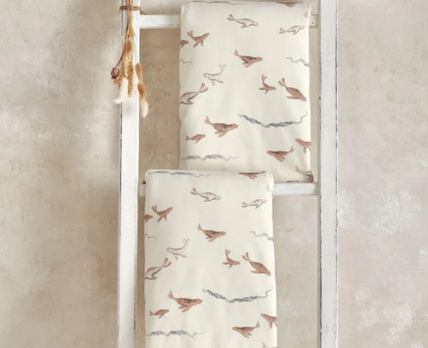 The cotbed fitted sheets pack includes two ultra-soft 100% cotton jersey sheets designed to fit cotbed mattresses securely and comfortably. Featuring a charming hand-sketched seal print in soft browns and ocean blues on a neutral base, they offer breathable comfort for everyday sleep while maintaining their natural stretch wash after wash.