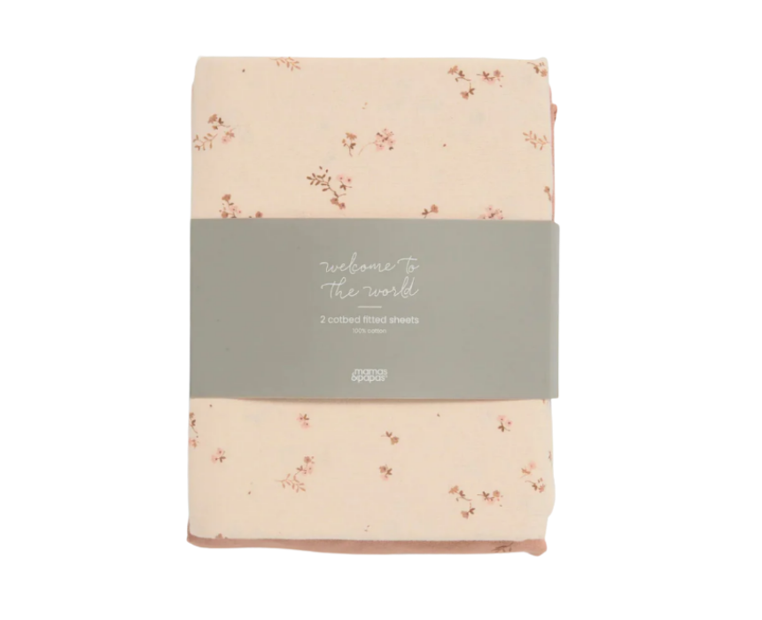 The cotbed fitted sheets pack includes two ultra-soft jersey cotton sheets designed to fit all standard cotbed mattresses. Featuring one rose pink sheet with a ditsy floral print and one dusky pink sheet with a meadow sprig design, they offer breathable comfort and a gentle feel for everyday sleep. The soft jersey fabric ensures a snug fit while remaining kind to delicate skin.