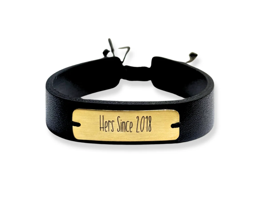 Couple Engraving Bracelet blends elegance with timeless style. Showcasing a sentimental caption engraving on a polished gold-plated plate. Set on a durable, adjustable band, this bracelet makes a strong statement.