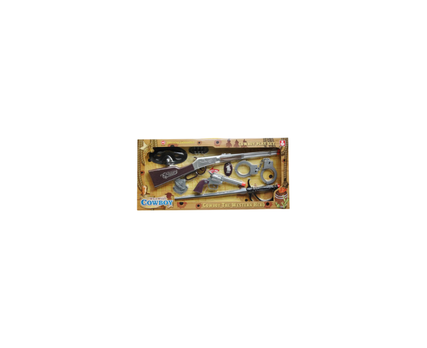 This cowboy-themed toy gun set includes a toy rifle, pistol, handcuffs, holster, and sheriff’s badge for exciting imaginative role-play. The guns feature realistic sounds, sometimes electronic, and may use 8-shot ring caps or toy bullets for added fun. Kids can wear the holster and badge to create an authentic western look during adventurous play.