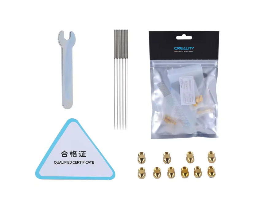 The Creality Nozzles & Nozzle Cleaners Package includes a variety of nozzles (0.3mm, 0.4mm, 0.5mm, 1.2mm) and five nozzle cleaners for maintaining optimal 3D printing performance. Perfect for hobbyists and professionals, this set ensures precise extrusion and easy maintenance for consistent, high-quality prints.