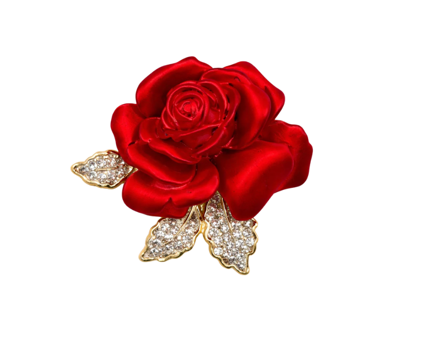 This brooch features a crimson velvet rose design accented with crystal leaves, creating a rich and elegant floral statement piece. Crafted with textured materials and sparkling details, it can be styled on jackets, blazers, dresses, scarves, hats, or bags to add a romantic touch and enhance both casual and formal outfits with depth and sophistication.