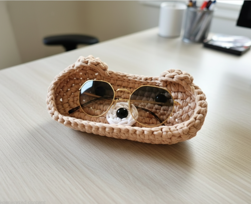 This handcrafted glasses holder is made from soft cotton Tshirt yarn in a light brown shade, offering a gentle and secure place to keep eyewear protected and easy to reach. Its flexible design fits perfectly on desks, bedside tables, or entryways, and it can be customised upon request through the shop to match personal style or home decor.