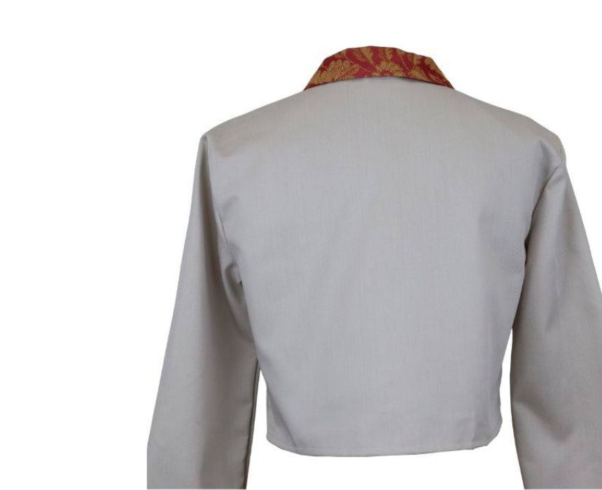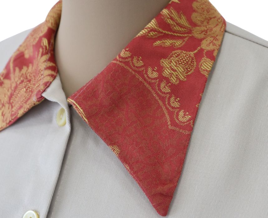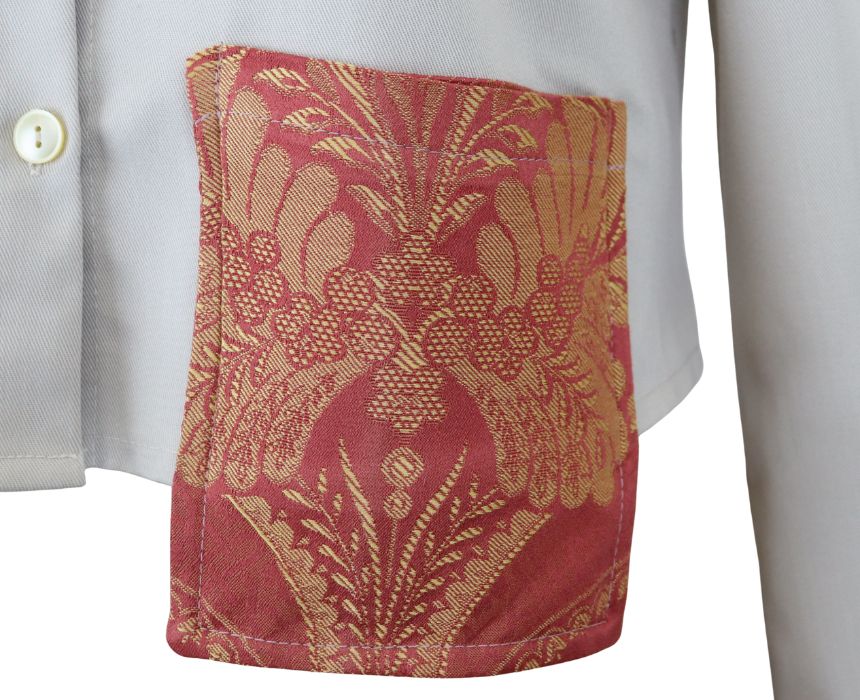 This cropped chic shirt in beige features a classic collar and a front pocket, crafted from brick red and golden patterned fabric for a bold yet elegant touch. Ideal for pairing with high-waisted trousers or denim, it adds warmth and sophistication to any casual or smart-casual outfit. A standout piece for effortless everyday wear.