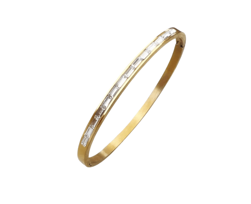 Crystal Embellished Bangle Bracelet features a sleek stainless steel design adorned with sparkling crystals. A glamorous and elegant accessory perfect for adding a touch of shine to any outfit.