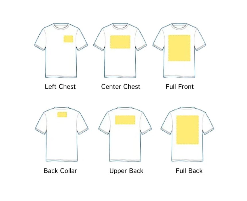 Left Chest ,Center Chest ,Full Front ,Back Collar ,Upper Back ,Full Back ,Back and Front |