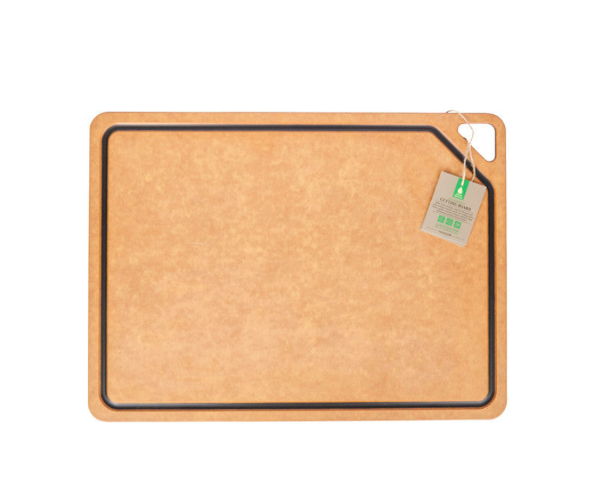 This large sustainable chopping board is made from craft paper and resin, creating a tough, antibacterial, food-safe surface that is gentle on knives and suitable for chopping meat, fish, poultry, fruit, and vegetables. Heat resistant and dishwasher safe, it also doubles as a trivet for hot pots and pans, measuring 44 x 32.5 cm in a slim brown design ideal for everyday prep and serving. Its flat, modern look suits contemporary kitchens and can be left on the countertop for easy access.