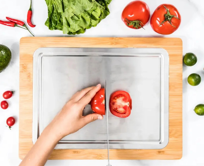 Upgrade your kitchen with this reversible premium cutting board featuring eco-friendly bamboo on one side and durable 304 stainless steel on the other. Designed with a nonslip base and integrated juice groove, it keeps your workspace clean while providing a stable surface for cutting fruits, vegetables, meats, and more. Perfect for everyday home use or professional cooking, this hygienic and versatile board combines style, durability, and functionality in one essential kitchen tool.