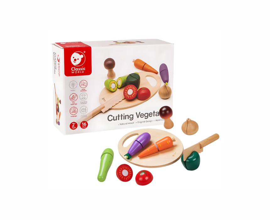 This Classic World vegetable cutting puzzle set is suitable for children aged 2 years and above and includes 17 wooden pieces for interactive and imaginative play. Kids can enjoy cutting realistic vegetable puzzles using the serrated wooden knife and cutting board, with touch fasteners allowing easy and safe cutting action. This engaging playset helps children learn about healthy foods while developing fine motor skills, hand eye coordination, and imaginative role play abilities.