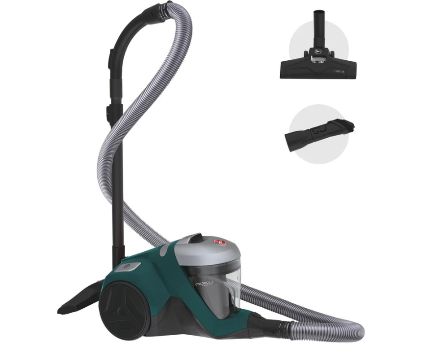 The Hoover H-Power 300 bagless cylinder vacuum in green features cyclonic suction, a 2L bin, and a washable H13 HEPA filter for effective dust and allergen removal. Its 1.5m + 2.5m stretch hose, 2-in-1 dusting brush, and crevice tool make it perfect for stairs, upholstery, and hard-to-reach areas, while the retractable handle ensures easy storage and portability. Ideal for versatile, powerful, and convenient home cleaning.