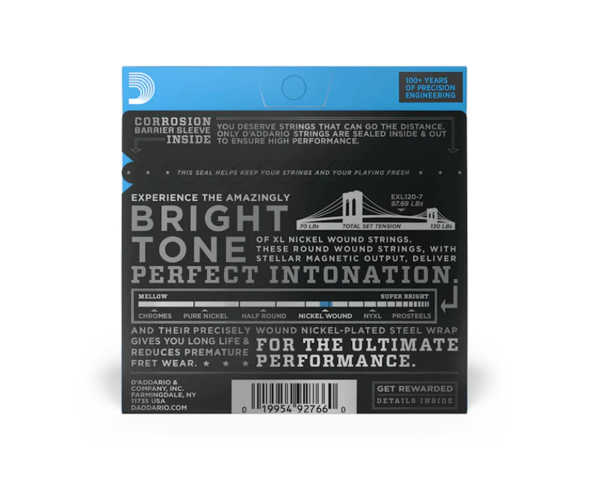 XL Nickel Wound delivers D’Addario’s iconic bright, versatile tone with a high carbon steel core and nickel-plated steel wrap wire, trusted by players since 1974. This 09-54 Super Light 7-string set offers exceptional flexibility and a sharp, responsive bite, making it a top choice for fast, expressive playing across modern styles.