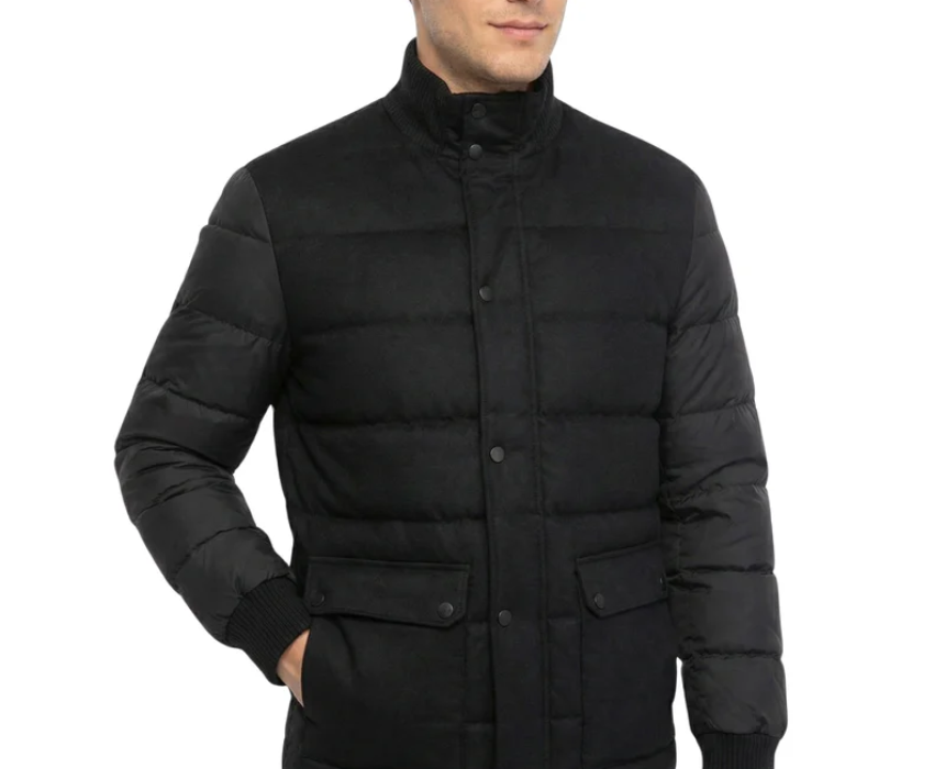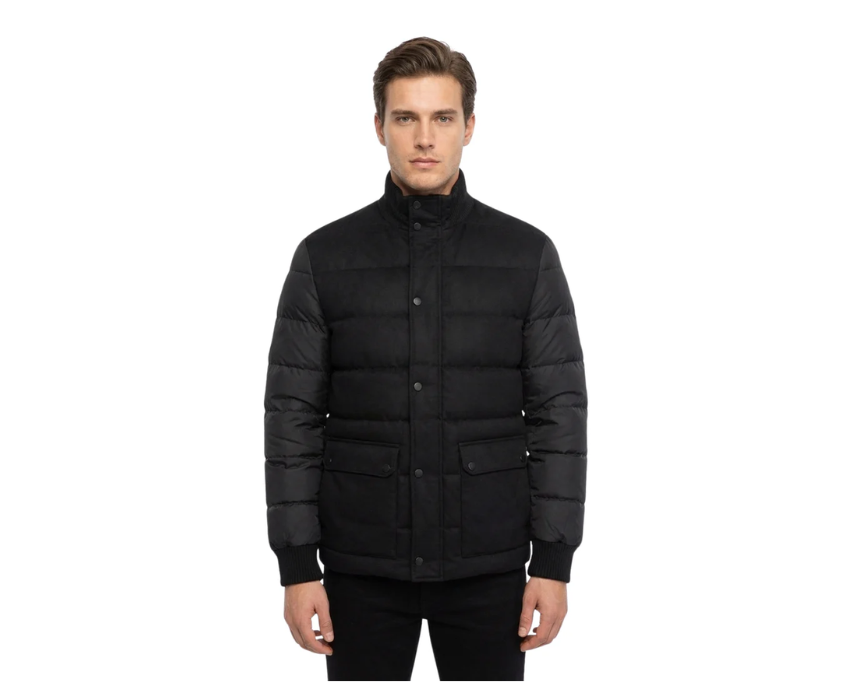 The Damat Black Padded Jacket With Stand Up Collar features a warm, insulated design in classic black, crafted with a stand-up collar for added protection and style. Its padded construction provides comfort and versatility, making it ideal for casual wear or layering over smart-casual outfits. It can be paired with jeans and boots for a relaxed look or layered over chinos for a polished, winter-ready ensemble.