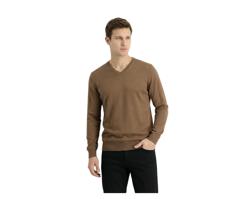 The Damat Long Sleeve V-Neck Knitwear Brown Pullover features a soft, comfortable knit in a warm brown shade, designed with a classic V-neckline and long sleeves for a versatile, stylish look. Its lightweight yet cozy fabric is ideal for layering over shirts for smart-casual outfits or wearing alone for a polished everyday ensemble. Pair it with chinos or jeans for a refined, casual style.
