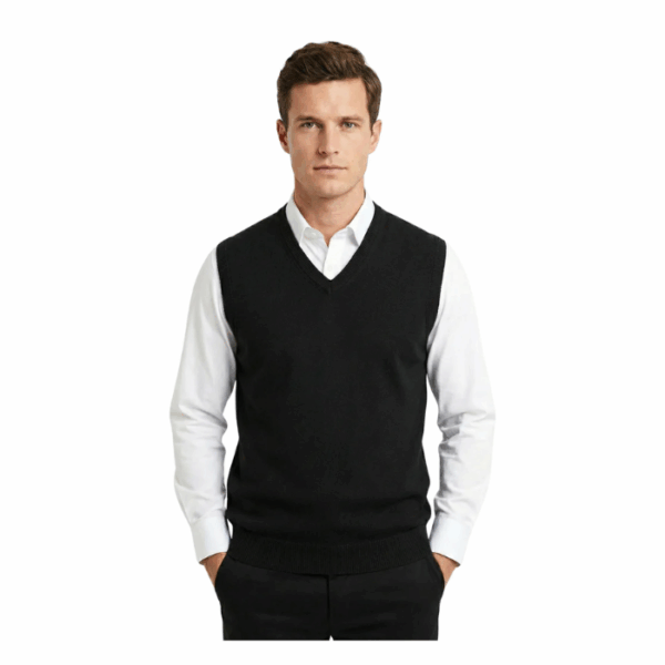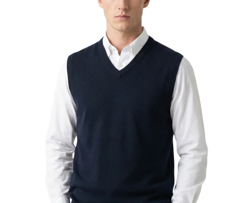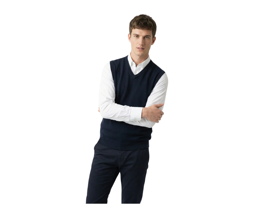 The Damat Navy Sleeveless V-Neck Pullover features a classic sleeveless design in a deep navy shade, crafted for comfort and effortless style. Its V-neckline adds a refined touch, making it ideal for layering over shirts or wearing on its own for a smart-casual look. It can be paired with chinos and loafers for a polished outfit or layered over a button-down shirt for a sophisticated, office-ready ensemble.