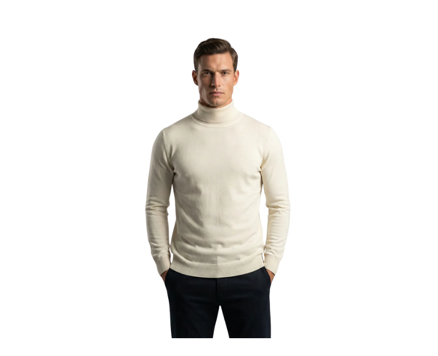 The Damat OffWhite High Neck Knitted Pullover features a soft, cozy knit in an elegant offwhite shade, designed with a high neckline and long sleeves for a stylish, versatile look. Its comfortable fabric makes it perfect for layering under jackets or wearing alone for a polished casual or smart-casual outfit. Pair it with chinos or jeans for a refined, everyday ensemble.