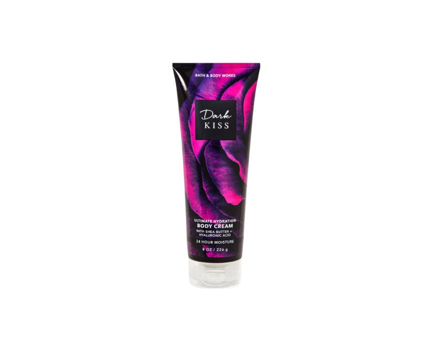 Dark Kiss Body Cream by Bath and Body Works delivers 24-hour moisture with a rich, luxurious texture that leaves skin soft, smooth, and replenished. Infused with vitamin E, aloe, shea and cocoa butters, and hyaluronic acid, it nourishes without parabens or artificial dyes. Its seductive fragrance features black raspberry, burgundy rose, bergamot incense, dark vanilla bean, and plum musk, perfect for layering with the matching body mist for an alluring nighttime scent.