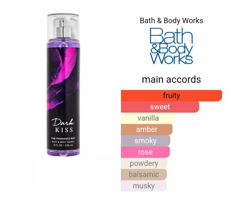 Dark Kiss Body Mist (236 ml) by Bath and Body Works delivers a light-as-air, layerable fragrance that scents the skin with a sweet, seductive blend of black raspberry, burgundy rose, bergamot incense, dark vanilla bean, and plum musk. Made without parabens and dermatologist tested, it offers great coverage for a long-lasting scent. Ideal for evening wear or layering with other fragrances to create a personalized, captivating aroma.