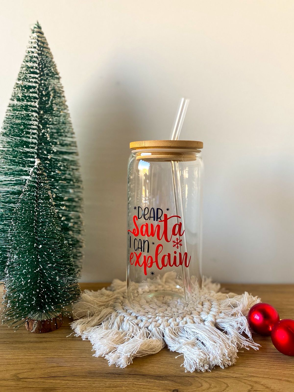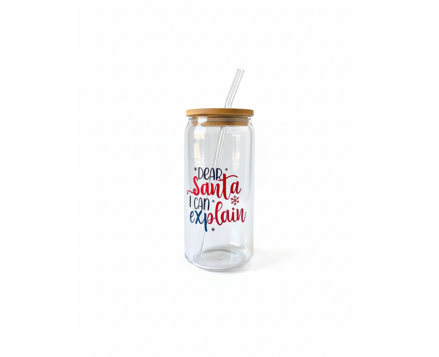 The “Dear Santa I Can Explain” Glass Cup is a 500 ml borosilicate glass tumbler featuring a cheeky holiday message, secured with a natural wood lid and a reusable straw for fun, convenient, and spill-proof sipping. Perfect for enjoying large iced coffee or cold festive drinks, this charming glass adds a humorous, playful element to your seasonal routine. Use it as a conversation starter at your next holiday party or as a witty gift for someone on the naughty list.