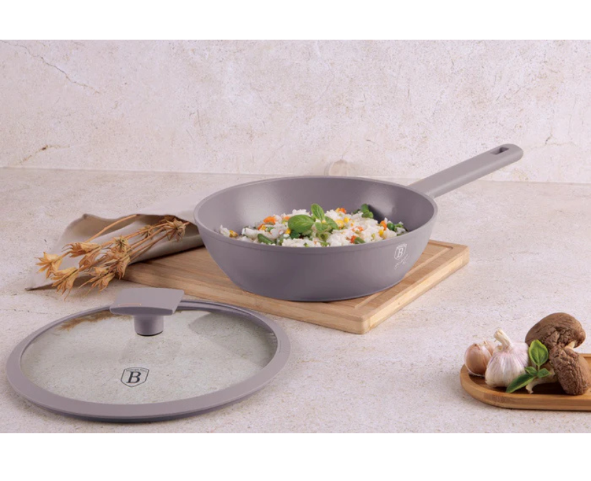 This 24cm matt taupe frypan with tempered glass lid features forged aluminum construction and a 3x durable TitanPro non-stick coating for effortless cooking and easy cleanup. The turbo induction base ensures even heat on all hobs, while being PFOA, lead, and cadmium-free for safe, eco-friendly meals. Ideal for frying, sautéing, simmering, or slow-cooking, it combines style, performance, and versatility in every kitchen.
