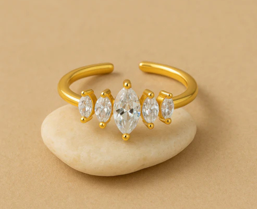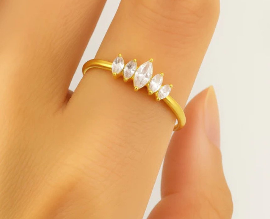 The Delicate Spark Ring is crafted from 18K Gold Plated Stainless Steel and features a refined design with a subtle crowned detail, perfect for adding elegance and poise to any outfit, can be worn alone for a sophisticated statement or paired with other rings for layered style, ideal for casual or formal occasions.