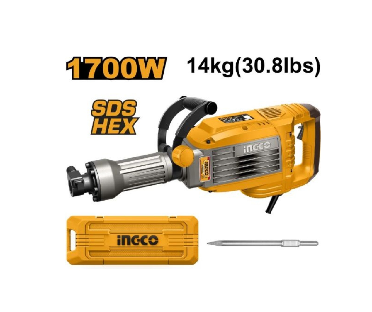The Demolition Breaker is a powerful 1700W tool built for efficient concrete breaking and demolition tasks. Featuring a 14KG design with SDS Hex system and oil lubrication, it ensures strong performance and durability for professional use.