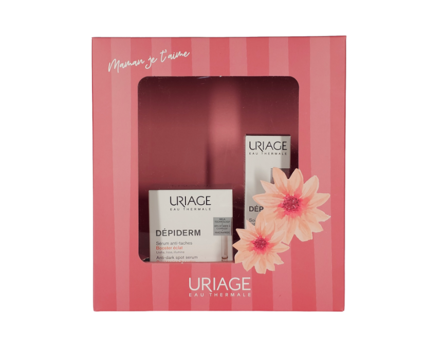 The Uriage Depiderm Coffret is a brightening and protective skincare set featuring a high-SPF day cream and depigmenting serum. The SPF50 cream hydrates and shields skin from UV damage, while the serum targets dark spots and promotes an even, radiant complexion. Enriched with Uriage thermal water, both formulas soothe and strengthen the skin barrier for sensitive or pigmented skin with daily use.