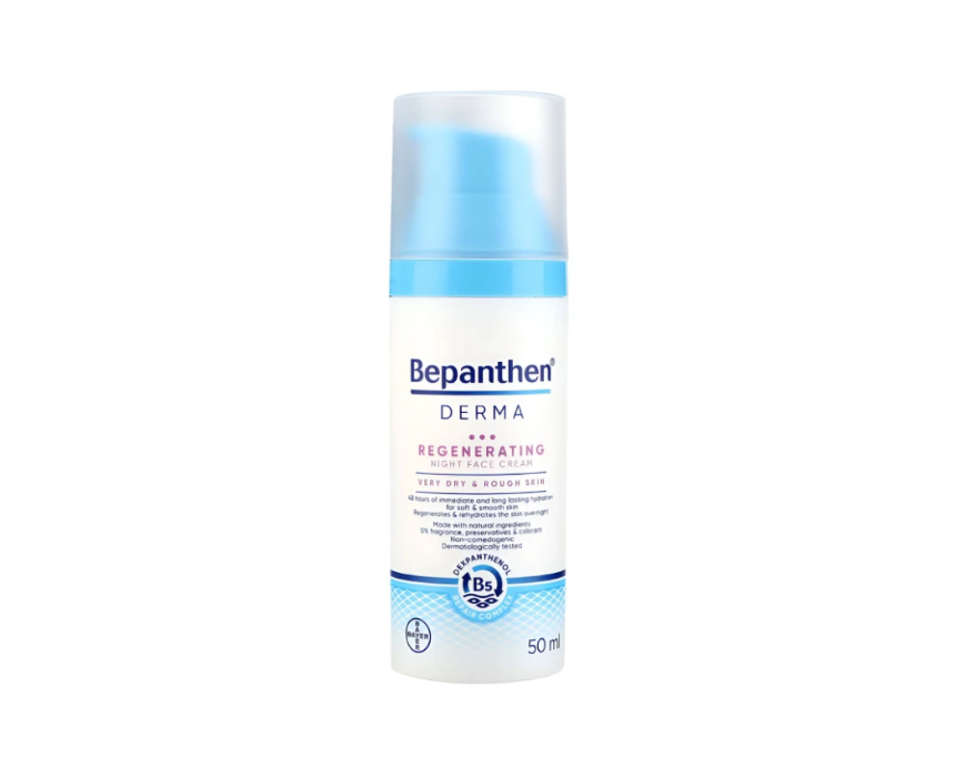 Bepanthen Derma Regenerating Night Face Cream 50 ml deeply hydrates and soothes very dry, sensitive skin overnight. Enriched with Pro‑Vitamin B5, Niacinamide, shea butter, argan oil, and glycerin, it supports natural skin regeneration while delivering up to 48 hours of moisture. Gentle, fragrance-free, and non-greasy, it helps restore softness, smoothness, and a radiant complexion by morning.