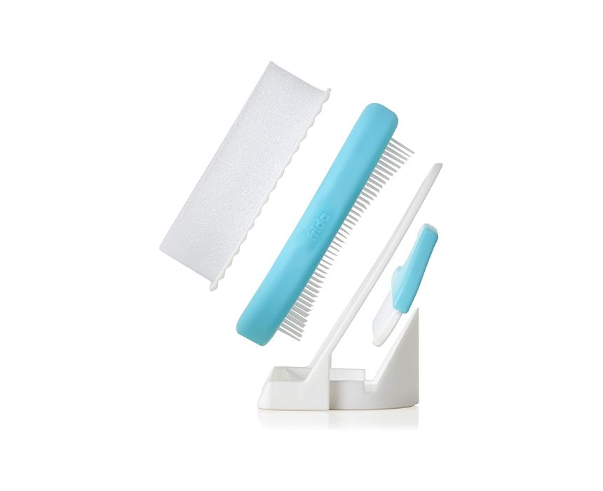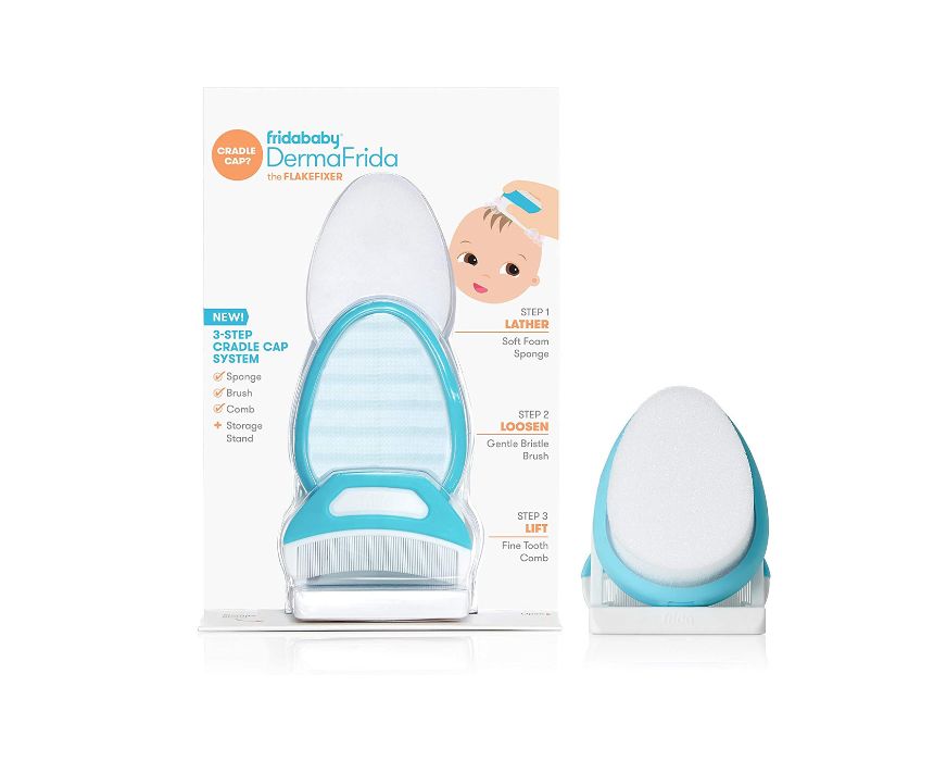 DermaFrida The Flakefixer is a gentle 3-step system designed to effectively treat cradle cap in babies, a condition affecting nearly 70% of infants. The process begins by lathering with a soft sponge, then loosening flakes with a specialized brush, and finally lifting them away using a fine-toothed comb. This easy routine helps parents reduce flakes and soothe their baby’s scalp for a healthier, happier look.