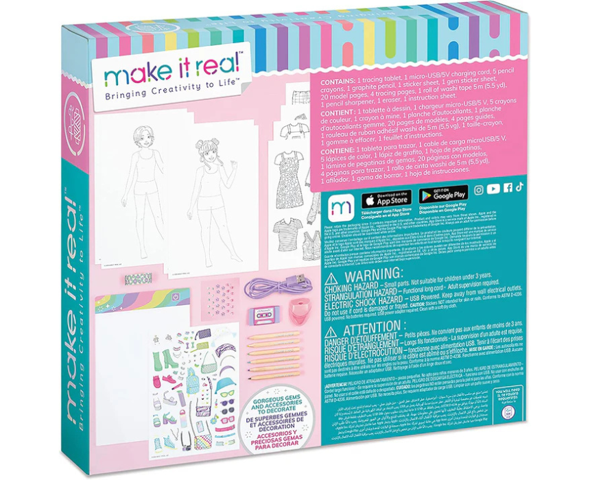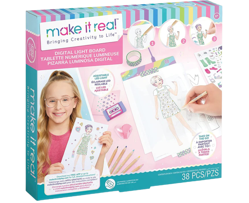 Young fashion designers can explore their creativity with this light-up fashion board, featuring adjustable LED light, included model and tracing pages, pencils, stickers, and gems for designing and styling. Lightweight and portable, it’s perfect for tweens to take on the go and display their creations with included washi tape. A fun and inspiring gift for any occasion.