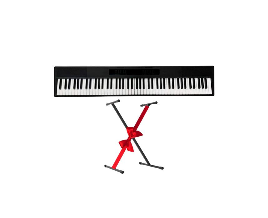 The MB121 Digital Stage Piano is an 88-key full-size keyboard with touch response, 300 tones, 300 rhythm styles, and 80 demo songs, ideal for beginners and performers seeking versatility. Its performance features include layer, split, vibrato, metronome, transpose, intelligent teaching modes, and accompaniment controls, while connectivity options include USB MIDI, headphone, AUX, and sustain pedal jack. The piano comes with a stand, sustain pedal, power adapter, and music rest, and can be styled on stage or at home for practice, lessons, or performances.
