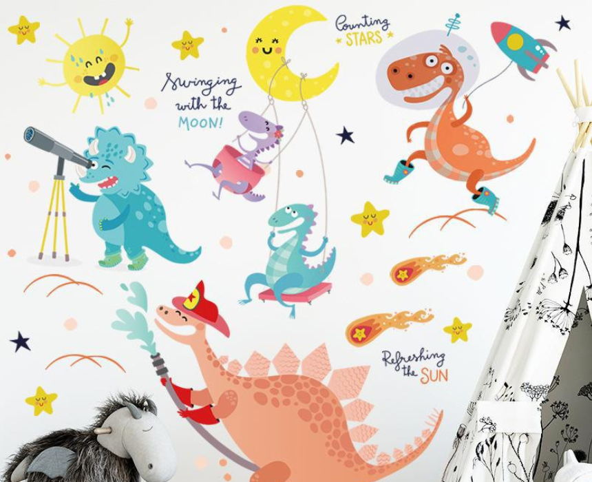 Dinosaurs with the Solar System Wall Decal combines colorful dinosaurs and planets to create an engaging and educational wall decoration for kids’ rooms or nurseries. With a wall coverage size of 94 H x 114 W cm, it is easy to apply and removes without residue. Perfect for inspiring curiosity and imagination, it brightens play areas, bedrooms, or study spaces with fun and learning.
