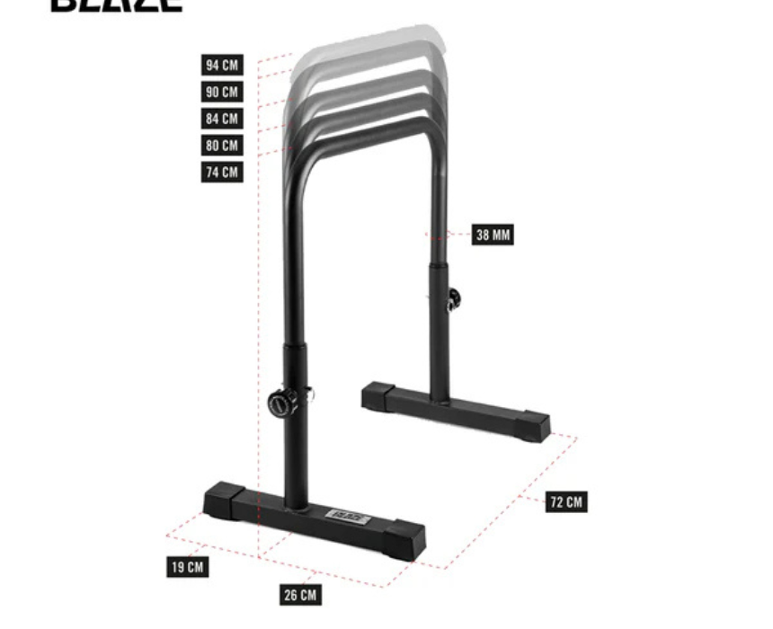 The Blaze Dip Parallel Bar is a compact yet heavy-duty bodyweight training station measuring 66.5×46×94cm, designed for dips, L-sits, and upper body strength work targeting the triceps, chest, shoulders, and core. Built with a sturdy steel frame and anti-slip rubber feet for stability and floor protection, it fits easily into home or gym spaces and is best used with training shoes and comfortable workout wear for safe, controlled movement.