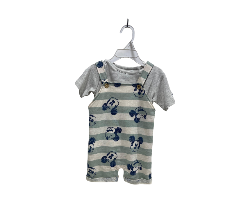 This 18-month Disney Baby set features sage green and white horizontally striped shortall overalls with a sketched Mickey Mouse print. The overalls include wood-look buttons on the shoulder straps and are paired with a solid grey jersey-knit short-sleeve t-shirt. Made from soft, breathable cotton blend fabric, this set is gentle on baby skin and ideal for daily wear. To use, layer the overalls over the tee for a classic look. Please check the size (18M) prior to ordering to ensure a proper fit as this includes the shirt and overalls only.