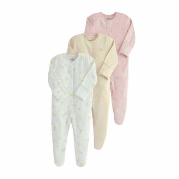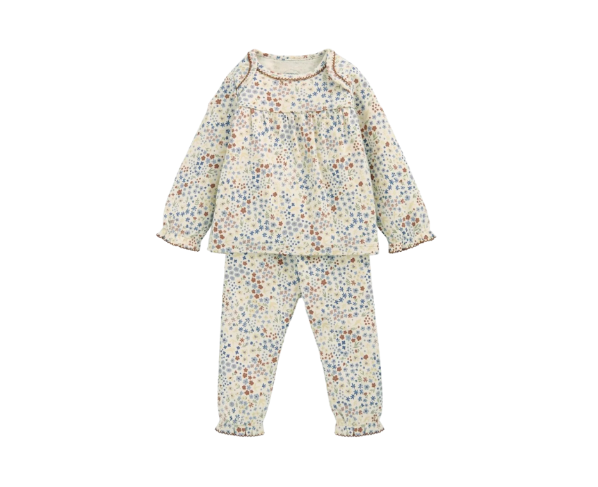 The Ditsy Floral Pyjamas are a soft and comfortable 2-piece set for babies and toddlers, crafted from 100% cotton for all-night comfort. The peplum-shaped top features elasticated cuffs and picot trim on the neck and sleeves, while the matching bottoms have an elasticated waist and gathered cuffs with coordinating picot detail. Perfect for bedtime or naptime, these pyjamas combine practicality with charming floral style.