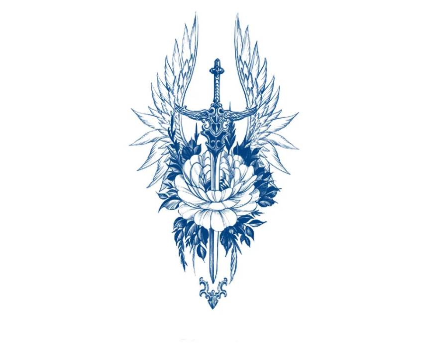 This Divine Sword Jagua Tattoo features a sharp and detailed warrior inspired design in a large 11 x 18 cm size, ideal for bold temporary body art. Made with natural jagua, it develops into a deep blue black tone on the skin and lasts for several days. Perfect for styling on the arm, back, or thigh, it adds a strong and edgy touch to streetwear, cosplay, or statement outfits.